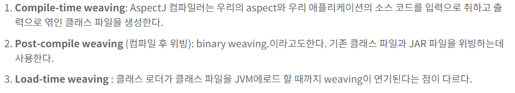 - Post-Complie 위빙 : 외부 라이브러리를 Weaving 할 때 사용한다. [Compile-Time 위빙]과 거의 동일한 동작을 한다. 보통 클래스파일을 JAR와 엮기 위해서 사용해서 [Binary 위빙]이라고 부르는게 일반적이다.