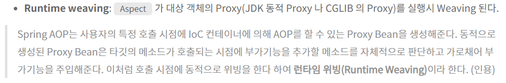- Spring AOP는 위에서 설명한 런타임 위빙(다이나믹 프록시)를 사용한다.