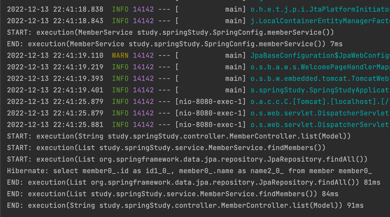 - 첫 START-END는 spring bean에 등록되면서 뜬 것이다.