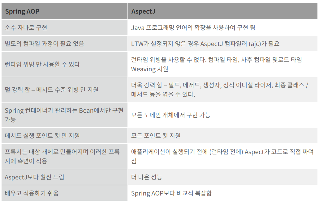 - 벤치마킹상 AspectJ가 Spring AOP보다 최소 8배, 최대 35배정도 빠르다