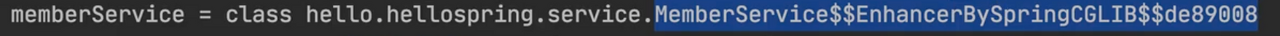 - memberService를 MemberController에 의존성 주입되는 시점에 실제로 memberService.getClass()로 로그를 찍어보면 그냥 memberService가 아닌 CGLIB에 의해 생성된 프록시 객체임을 알 수 있다.