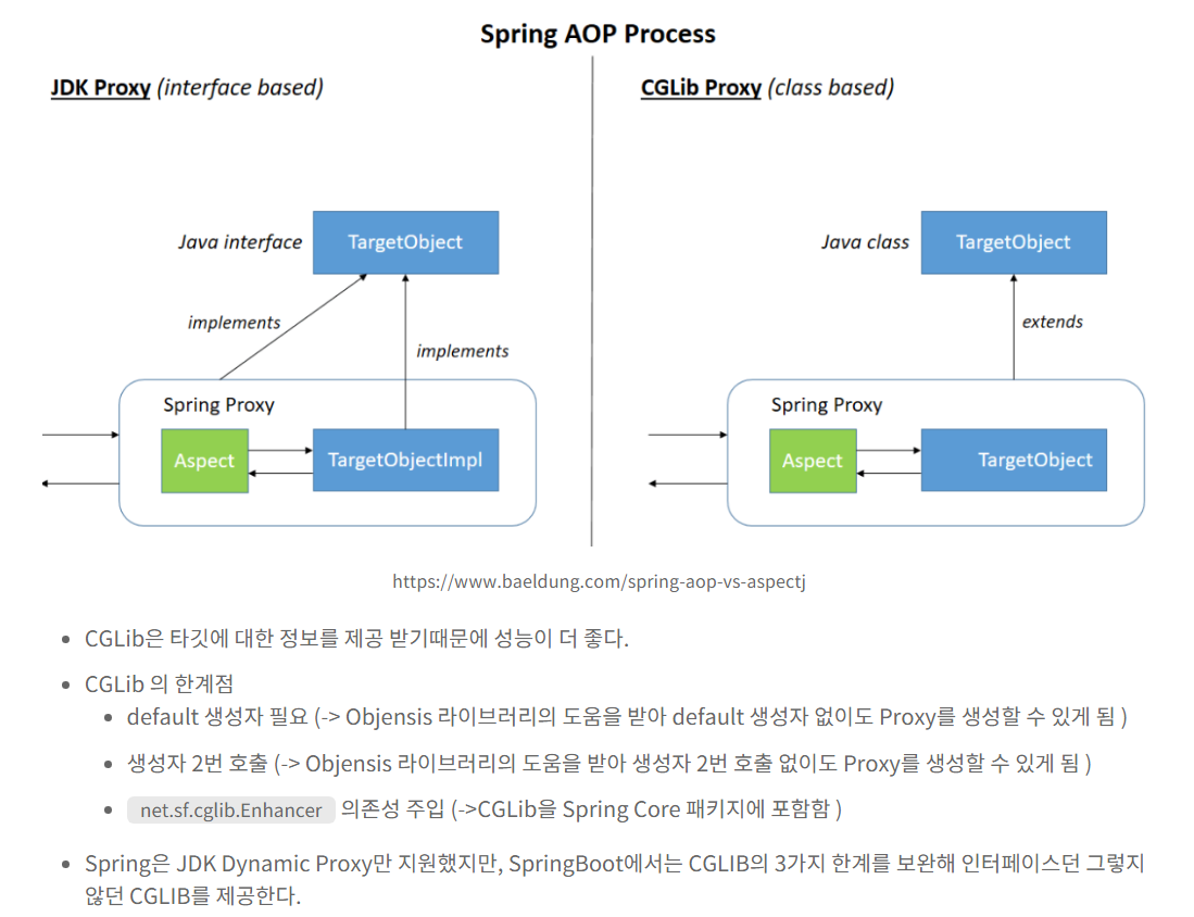 클래스 기반이기 때문에 인터페이스 기반의 JDK Dynamic Proxy보다 성능이 우수하다고 한다.